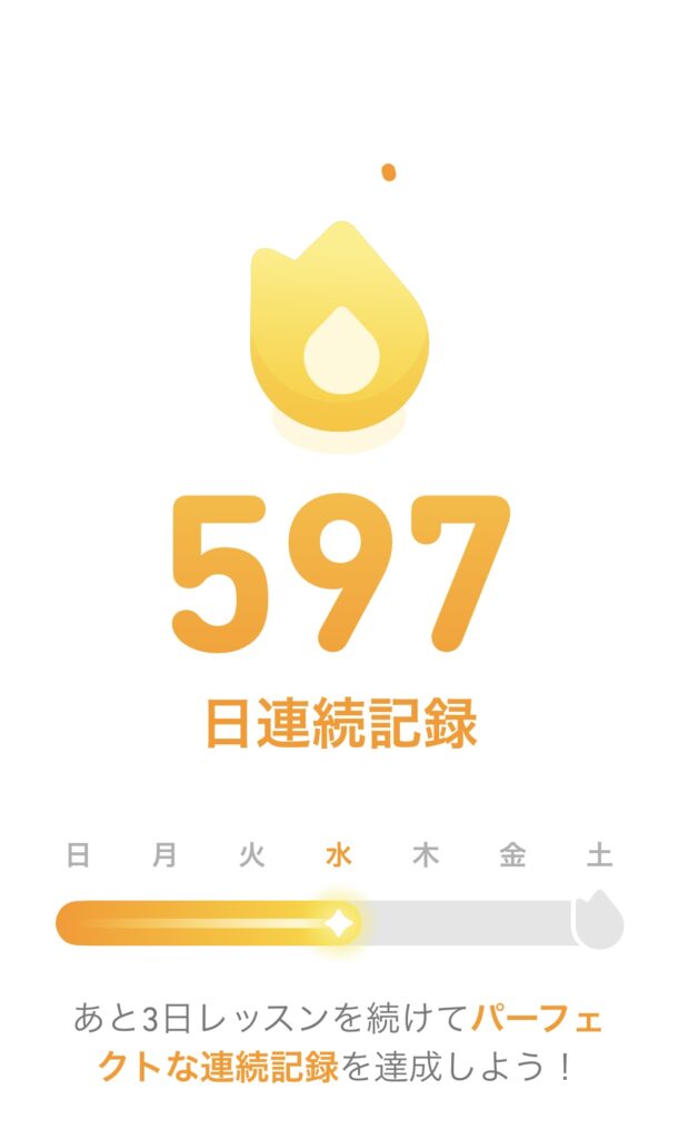 duolingoは楽しくて無限にレッスンする日もあれば忙しくて単語の復習のみで終わってしまう日などムラがありますが、今日現在597日連続記録を保っています(2025/10/22現在)。