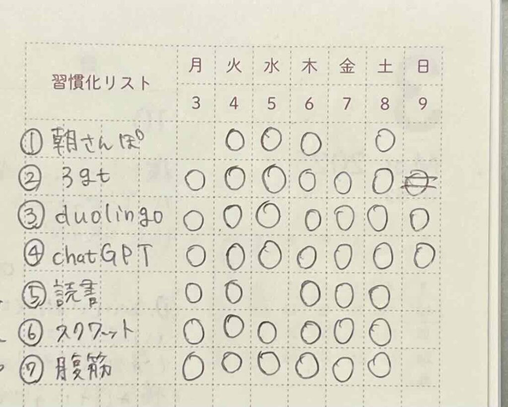 ③duolingo、⑤読書、⑦腹筋は短時間でもいいから毎日する、と決めています。